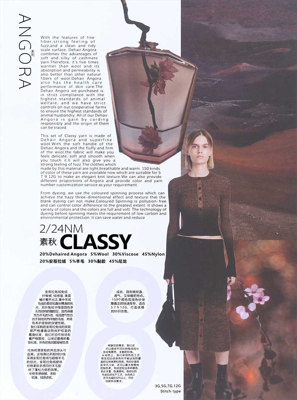 20%安哥拉绒Dehaired Angora 5%羊毛Wool 30%黏胶Viscose 45%尼龙Nylon
